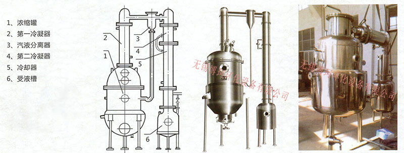 本設(shè)備主要包括濃縮罐、冷凝器、汽液分離器、冷卻器、受液桶六個部件組成,由不銹鋼制造。濃縮罐為夾套結(jié)構(gòu)、冷凝器為列管式,冷卻器為盤管式。
